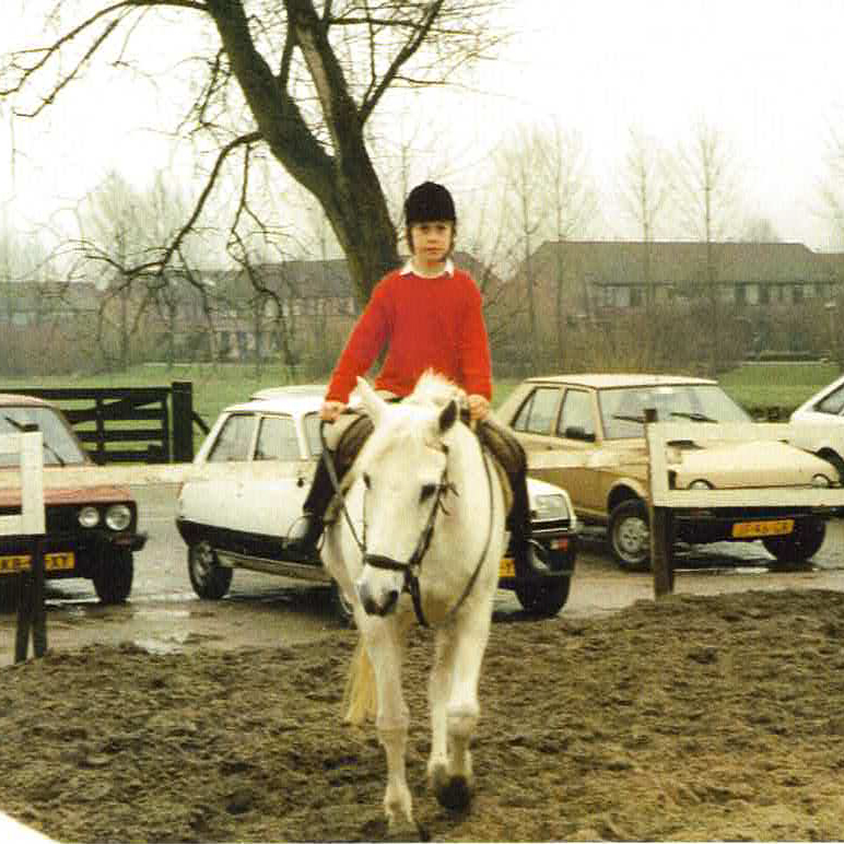 Hier ben ik vlak voor de wedstrijd, met mijn vaste manegepony. Samen met mijn beste vriendinnetje buiten rijden en paarden verzorgen was het leukste dat er was. Toen al lagen natuur en dieren me na aan het hart.